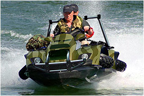 Родная стихия для квадроцикла, как известно, это бездорожье. Глиняные броды по пояс, поваленные деревья, непролазные на первый взгляд болотные топи хорошо подготовленный мотовездеход вполне способен покорить. И единственное, что может остановить квадрик – это водная преграда. Нет, можно, конечно, возразить, мол, если вывести шноркель повыше, на передний и задний багажники закрепить и накачать камеры от камазовских колёс и до кучи гидроизолировать проводку ATV, то вполне можно переплыть небольшое озерцо. Скорость движения квадроцикла по воде не бог весть какая (от силы можно развить километров, этак, 5 в час), да и риск уйти под воду вместе с дорогостоящей техникой весьма велик. И видимо эта явная вражда мотовездеходов с водной стихией вдохновила сотрудников британской компании Gibbs Technologies Ltd. на создание водоплавающего квадроцикла под названием Quadski.